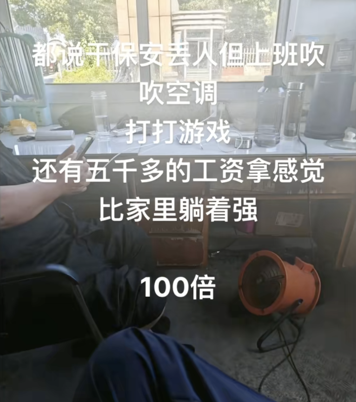 这一类人也会展示自己在保安亭的日常。他们往往会以身作则,为观众们介绍当保安有多么滋润。不仅手机能玩到手酸,还能全年享用Wifi服务,和冬暖夏凉的空调保安亭。
